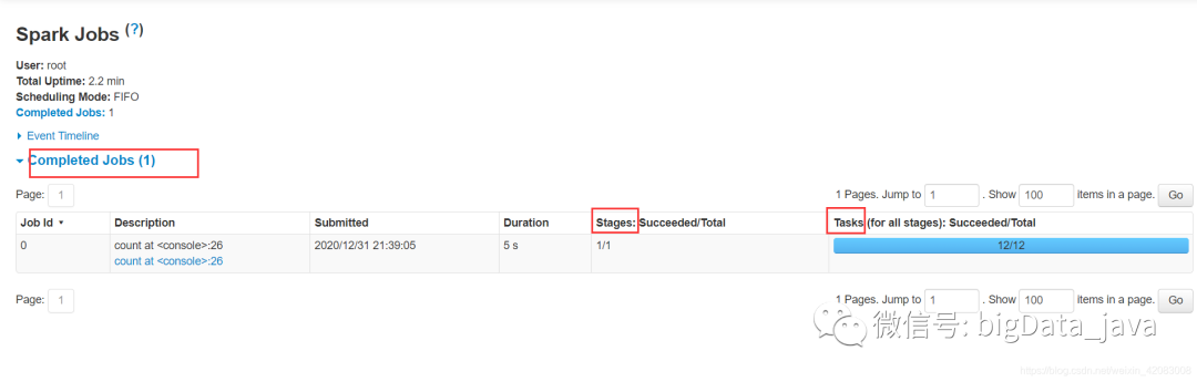可以看到已完成的job 数量为1 个,stage为1个,task数量为12个