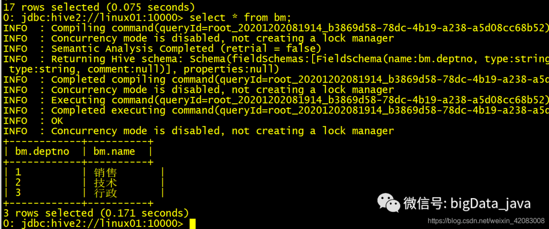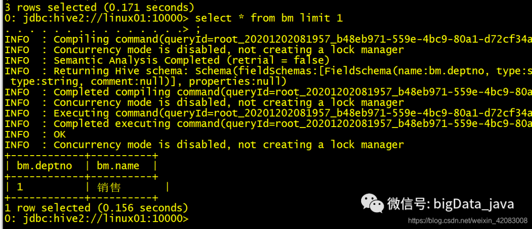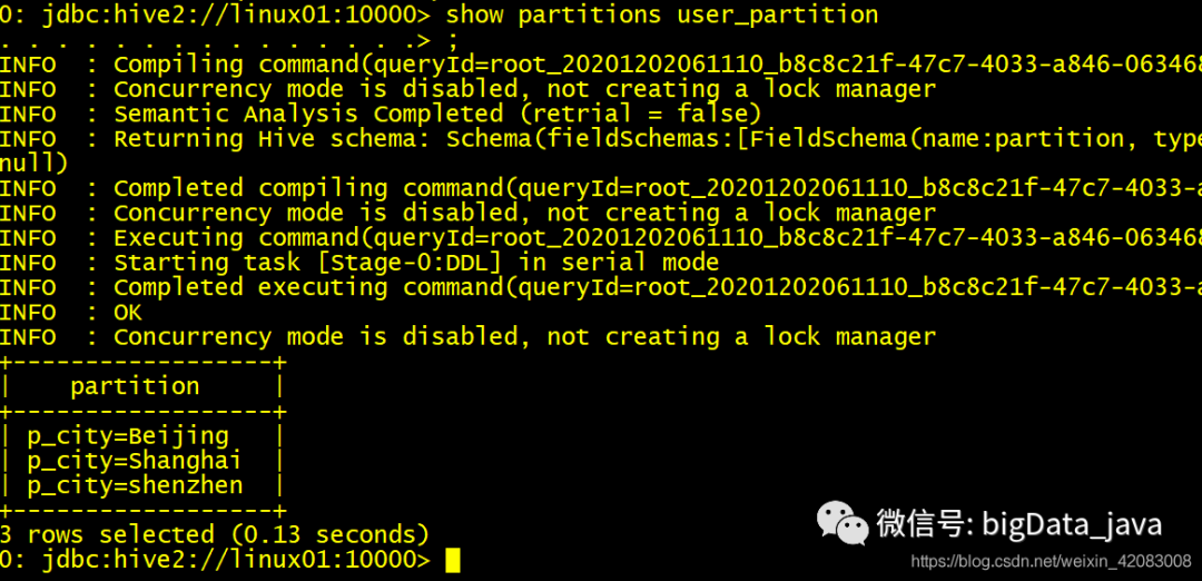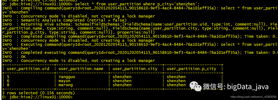 load data local inpath "/data/log/20201130.log" into table log_partition partition(y='2020',m='11',d='30');3)查数据