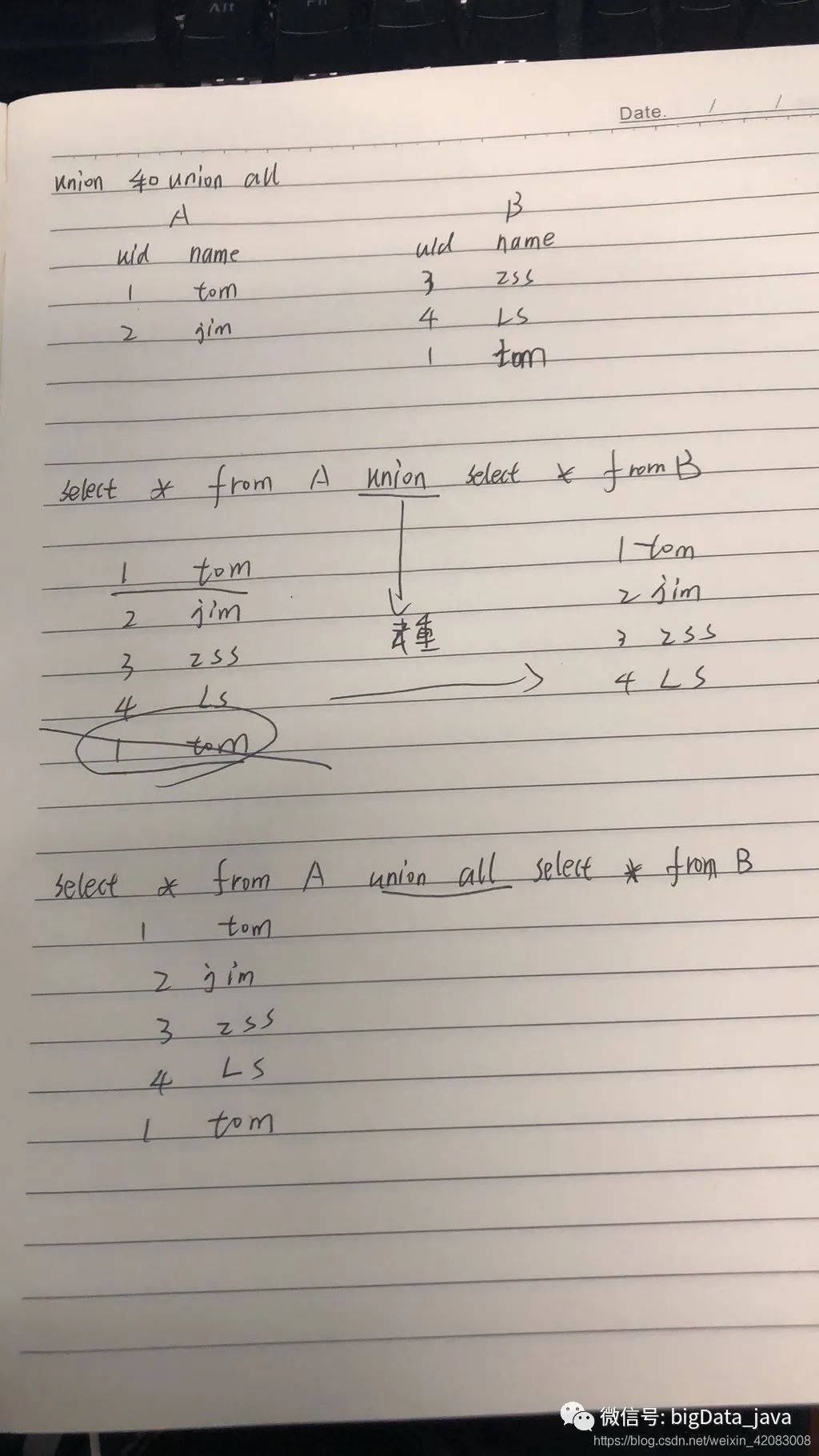 UNION ALL 是所有的,不去重 ;UNION 会进行去重