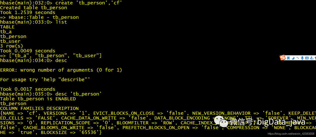 create 创建带有属性的表 create 'tab_name'