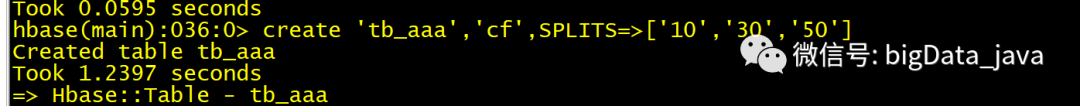 create 'table_name','cf_name',SPLITS=>['10','30','50'] 创建一个预分区为4个region的表 region1 :_-----10 region2 : 10------30 region3:30------50 region4:50-------_