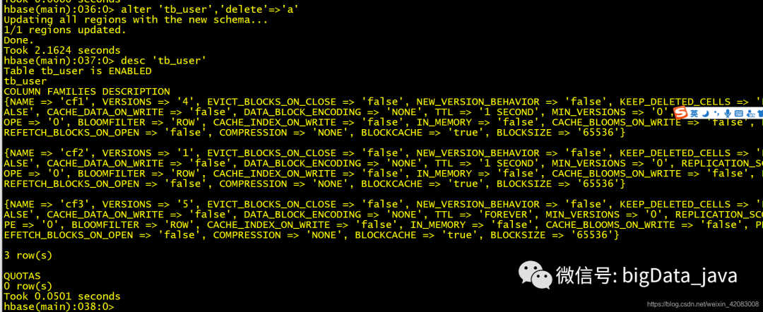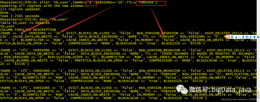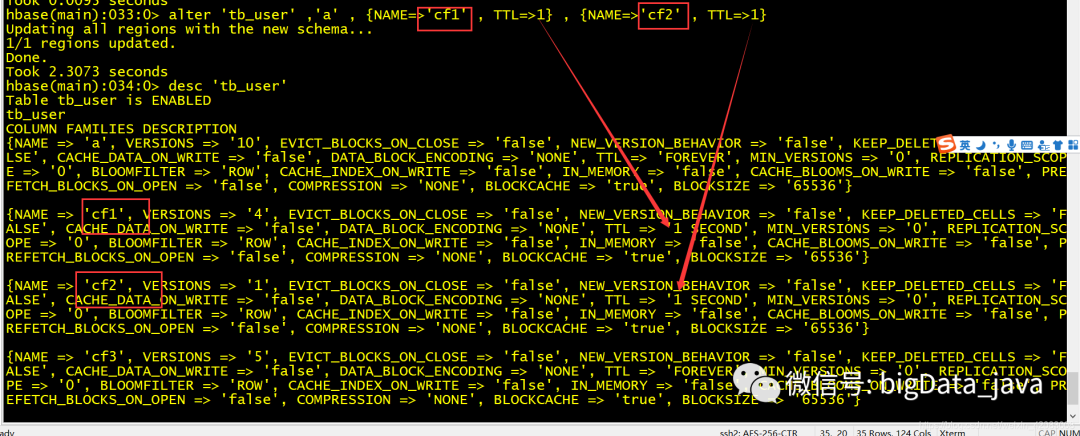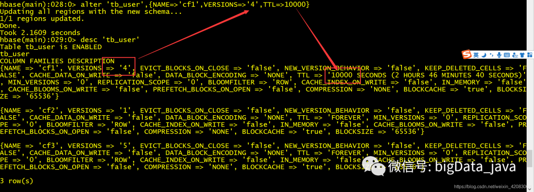 alter 'table_name',{NAME=>'cf1',VERSIONS=>'3',TTL=>10000} 将cf1列族 的VERSIONS修改为3 TTL修改为10000s