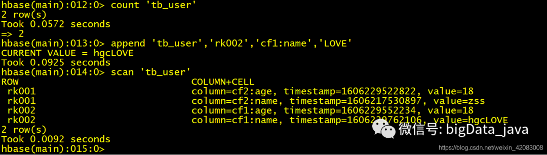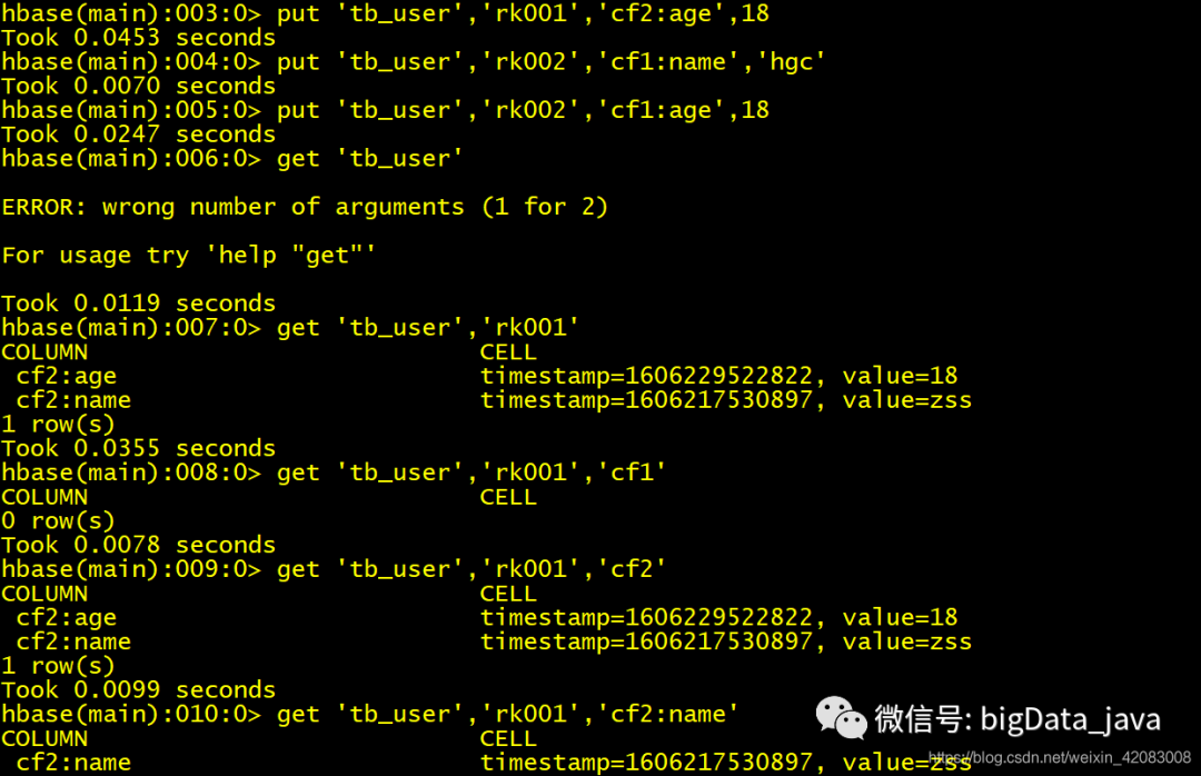 get 获取数据 属性值 get 'table_name','rowkey','cf_name:属性'