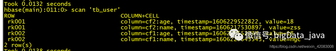 行数据 get 'table_name','rowkey'