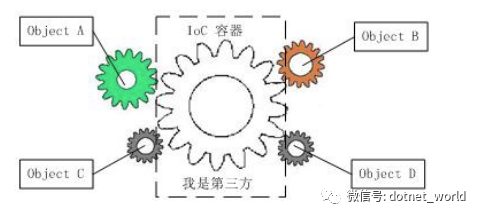 我们可以再试想一下,在一个大型项目一个模块当中,有这样若干个类,就4个吧,object a,b,c,d,a依赖于b,b依赖于c,c依赖于d,甚至还可能交叉依赖,这时候我们引入了第三方“IoC”,使得a,b,c,d这四个对象之间没有了耦合关系,如下图:齿轮之间的传动全部依靠“第三方”。全部对象的控制权上缴给IoC,由IoC来分配对象(-。-)所以,IoC容器就成了整个系统的核心,它类似于粘合剂,把所有的对象都给粘合在了一起,这样子相辅相成,发挥出最大的作用。如果没有它,对象彼此之间就失去了联系。
