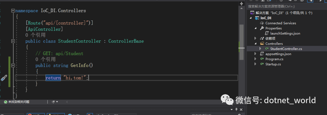 新建Web Core API应用程序,删除自带的weather控制器和类,新建空api控制器Student,新建方法,返回学生的问候语,并且启动监听,dotnet watch run,以便调试: