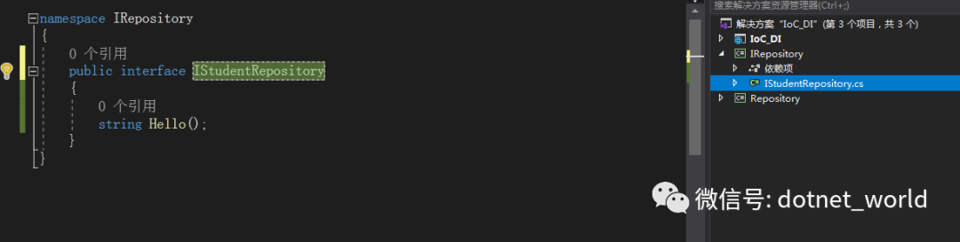现在问题来了,随着实际业务开发,我们的业务类当中的方法会越来越多,同名或者类似的方法数不胜数,我们直接定位进去就是一大堆方法和方法体,所以我们修改一下,根据面向接口编程原则,我们将其抽离,新建仓储接口类库,IRepository,新建接口类,IStudentRepository,原先的方法继承实现接口: