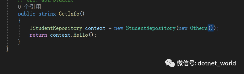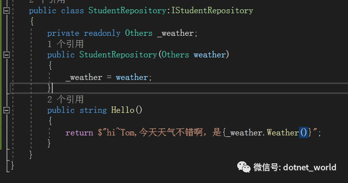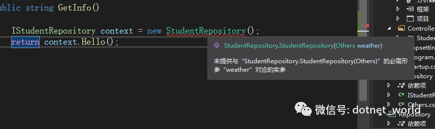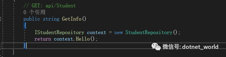在控制器当中,我们返回了一个学生的姓名。但是在实际开发当中,我们的业务逻辑部分是和控制器分开的,于是,我们新建一个仓储类库Repository,新建仓储服务类StudentRepository,新增业务方法,返回学生问候语: