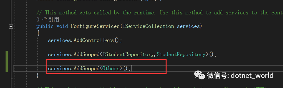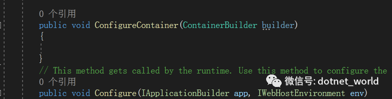 注释掉之前在ConfigureService中的注入方法,并在接着在Startup新增ConfigureContainer方法中新增注入,如下图: