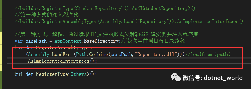 这个时候如果你再运行,肯定会报错,因为你api层跟Repository层解耦了,你就没法再用反射Load Repository层的程序集了。接下来我们改为使用读取dll文件反射动态地创建实例注入Repository层的程序集: