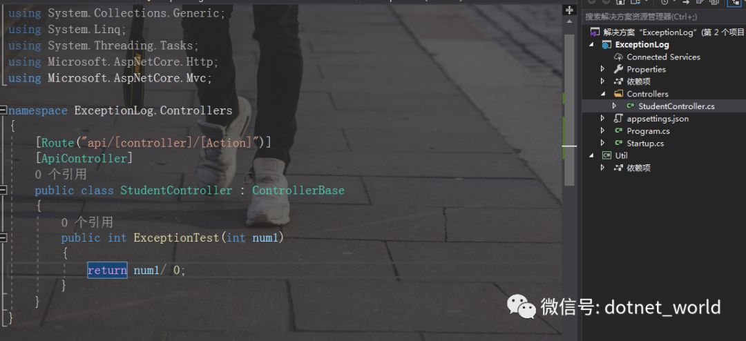新建API控制器StudentController,更改route规则,新建动作方法ExceptionTest,里面写入一个错误。新建基础设施层类库Util。