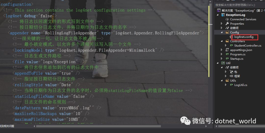 在API层下新建log4net.config配置文件,以配置日志相关设置,并且完成配置文件的内容。(内容无需自己手写,只需配置会用即可,下方内容中有详细注释,开发当中根据实际需要进行配置)