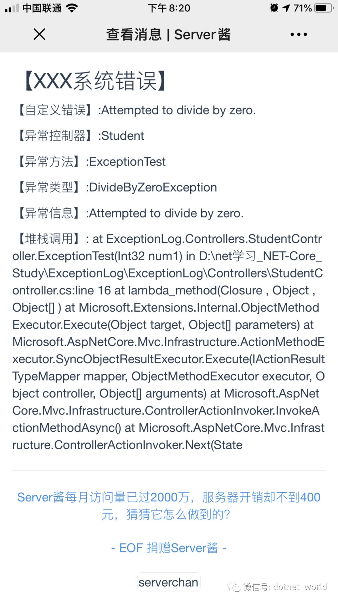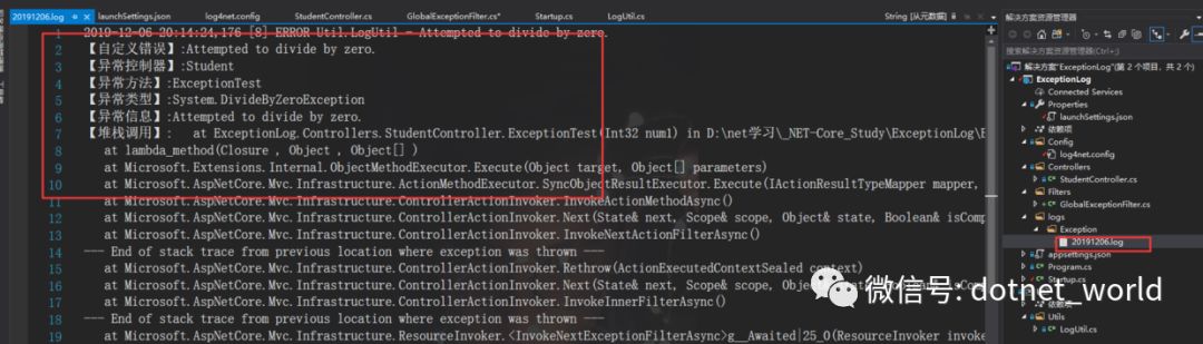 好了今天的实例到这里就结束了,多学习,多写,多思考,多交流,共同进步!关于邮箱通知的,下次补上,你们也可以自己试试,示例代码下载地址:https://github.com/huguangcheng/_NET-Core_Study/tree/master/ExceptionLog