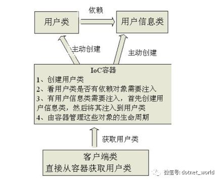 而当有了IoC/DI容器后,客户端获取这些服务,不再主动去索取了,不再主动去创建这些对象了。IoC会做这些动作:创建用户类,看用户类是否有依赖对象,有的话,首先创建依赖对象,之后再将其注入到用户类当中。由容器掌管这些对象的生命周期。