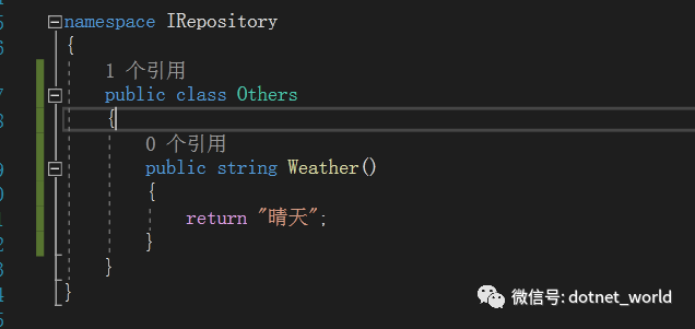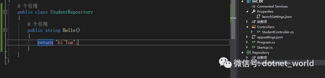 在控制器当中,我们返回了一个学生的姓名。但是在实际开发当中,我们的业务逻辑部分是和控制器分开的,于是,我们新建一个仓储类库Repository,新建仓储服务类StudentRepository,新增业务方法,返回学生问候语: