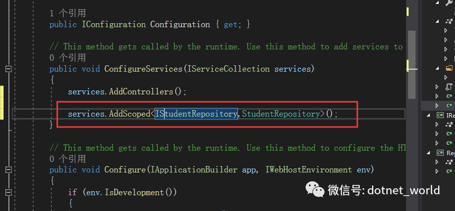 如上图,在Startup类的ConfigureServices方法当中注入。ConfigureServices这个东西是专门为我们的服务做准备工作的,怎么说呢,你警察执法需要警棍吧;大妈扫地需要扫帚吧,ConfigureServices里面其实就是为我们的服务注入所需要的工具,我们对象此时并没有说是被实例化,它只在你需要的时候,实例化,并注入到需要的对象当中去。