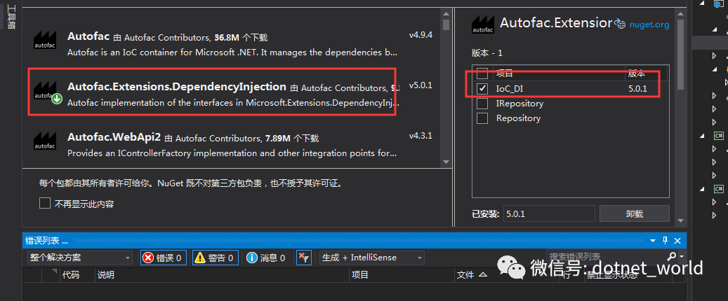 给api层引入nuget包,Autofac.Extensions.DependencyInjection,如下图: