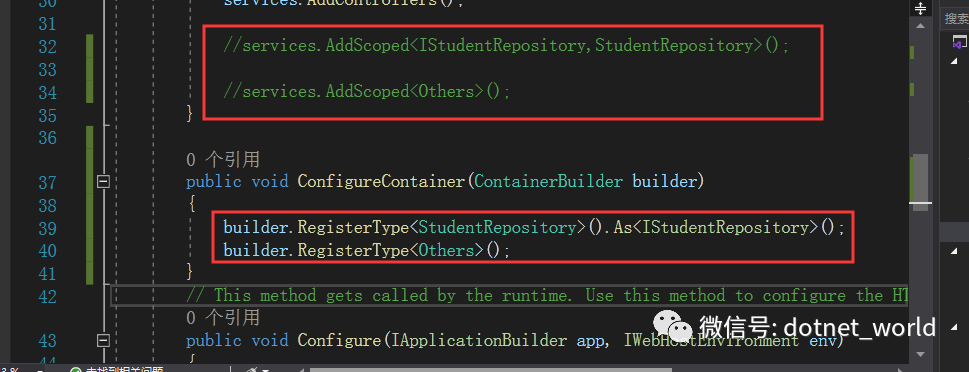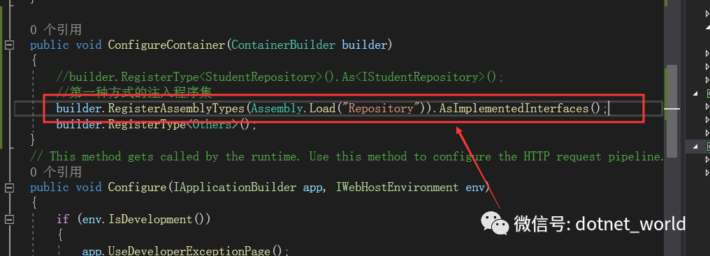 注释掉之前在ConfigureService中的注入方法,并在接着在Startup新增ConfigureContainer方法中新增注入,如下图: