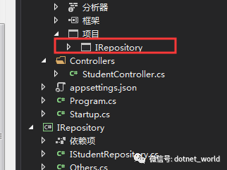 现在问题来了,随着实际业务开发,我们的业务类当中的方法会越来越多,同名或者类似的方法数不胜数,我们直接定位进去就是一大堆方法和方法体,所以我们修改一下,根据面向接口编程原则,我们将其抽离,新建仓储接口类库,IRepository,新建接口类,IStudentRepository,原先的方法继承实现接口: