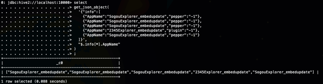 这里两次调用了regexp_replace,第一次是为了去掉两边的中括号,第二次是为了将,jons 里面的逗号和分割json 的逗号进行区分,因为我们按照数组内容之间的分隔符进行split ,所以这里可以看做是将数组字符串的分隔符有逗号换成了# 号,然后就按照# split 了