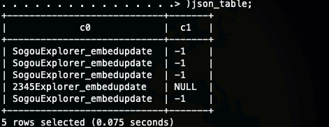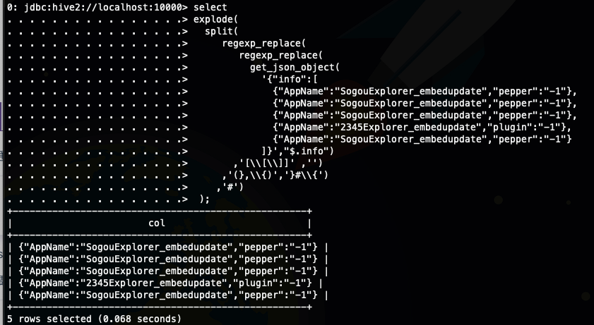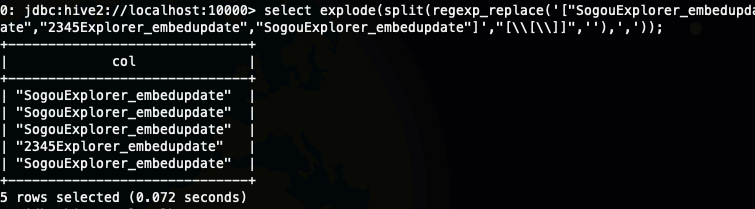 select explode(split(regexp_replace('["SogouExplorer_embedupdate","SogouExplorer_embedupdate","SogouExplorer_embedupdate","2345Explorer_embedupdate","SogouExplorer_embedupdate"]',"[\\[\\]]",''),','));