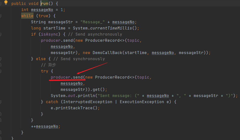 2、打开 Producer 类,看里面的 run 方法,看到异步发送消息的方法(当前位置:Producer)