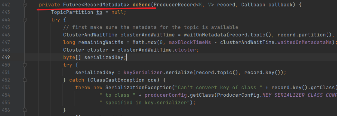 3、一直点到 doSend 方法里(当前位置:KafkaProducer)