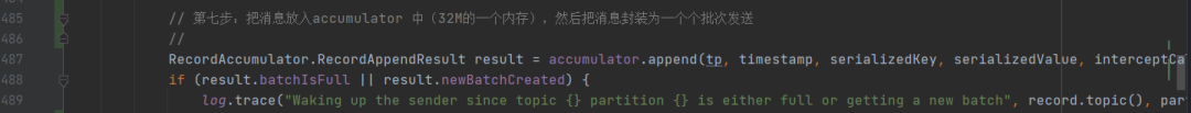 (7)第七步:把消息放入accumulator 中(32M的一个内存),然后把消息封装为一个个批次发送