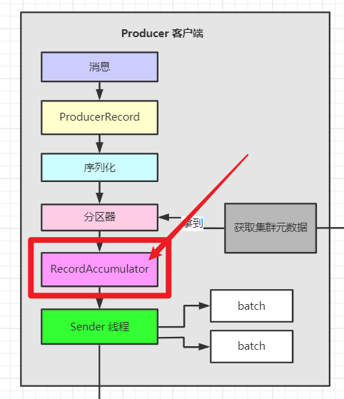 4、把消息放入 RecordAccumulator (32M 的内存中),然后分批次发送;