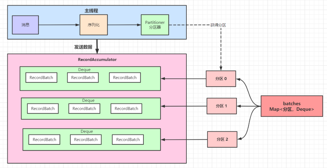 batches 这个 Map,会记录每个分区对应的 Deque,每个 Deque 里面放的是消息的批次。