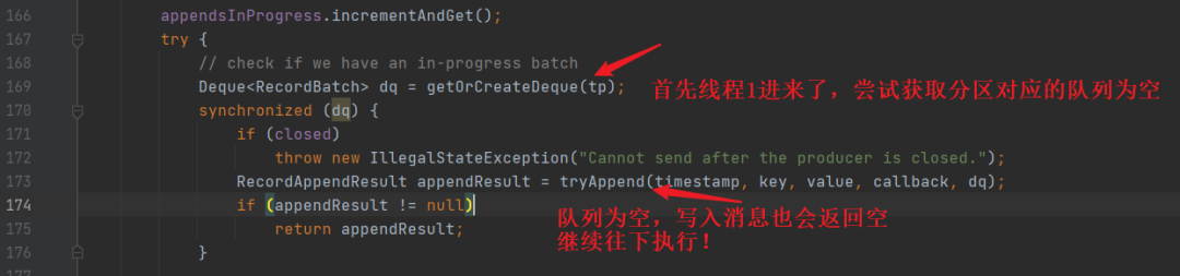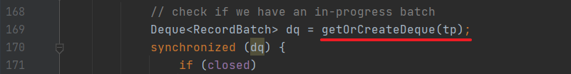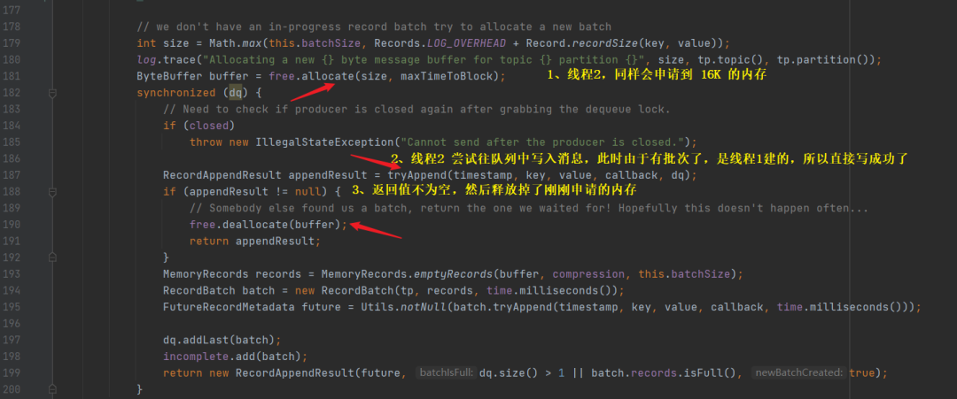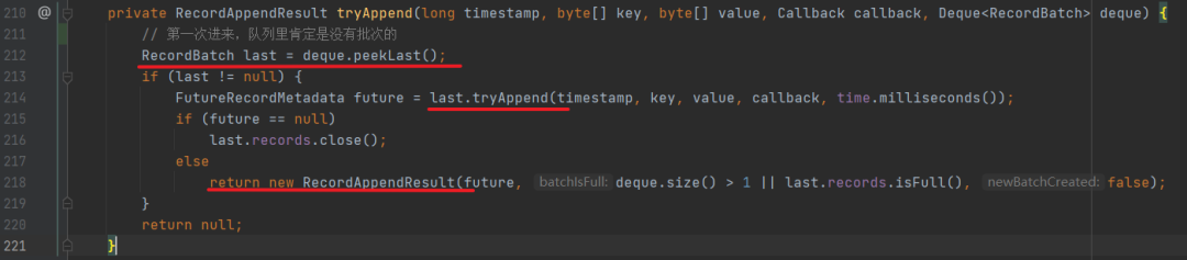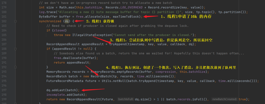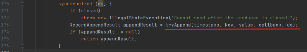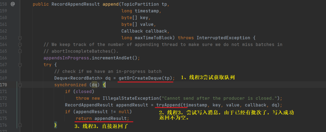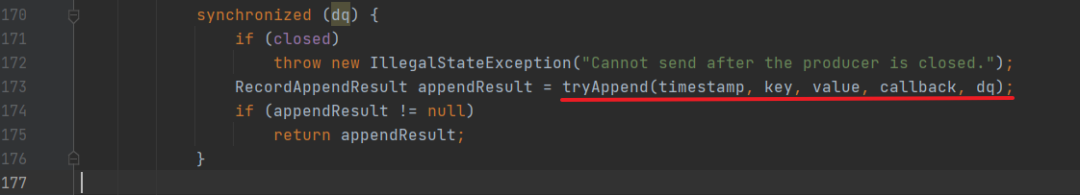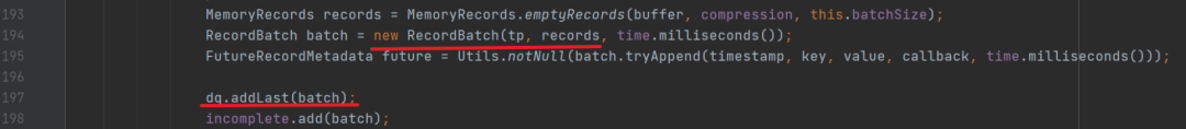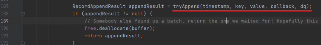 下面我们来看 RecordAccumulator 类的 append 方法(158 行)