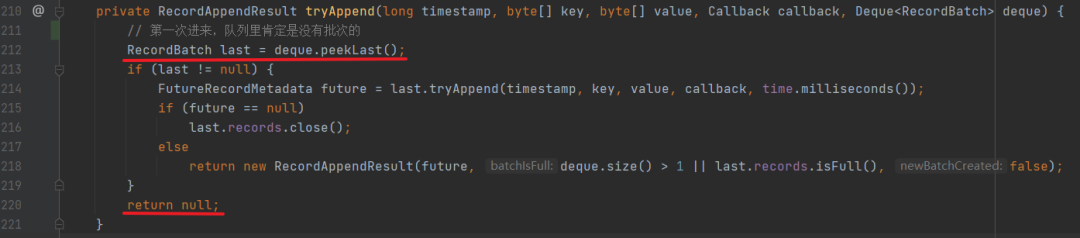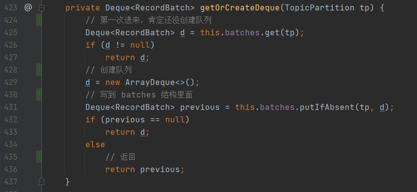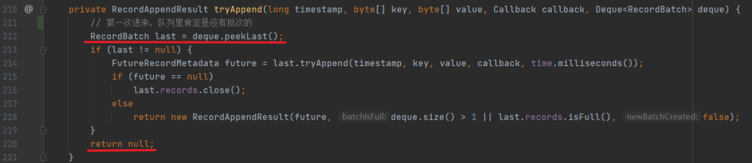 一开始分区对应的队列肯定是空的,所以创建了一个 ArrayDeque,放入到 batches 里面。