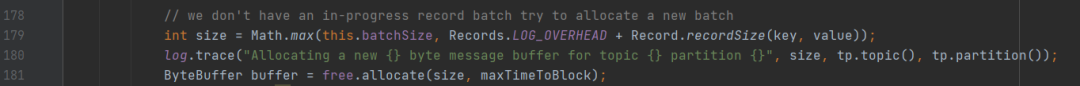 然后根据批次的大小(默认是 16K)和消息的大小,取一个最大值。防止特殊情况下,一个消息比批次还要大。