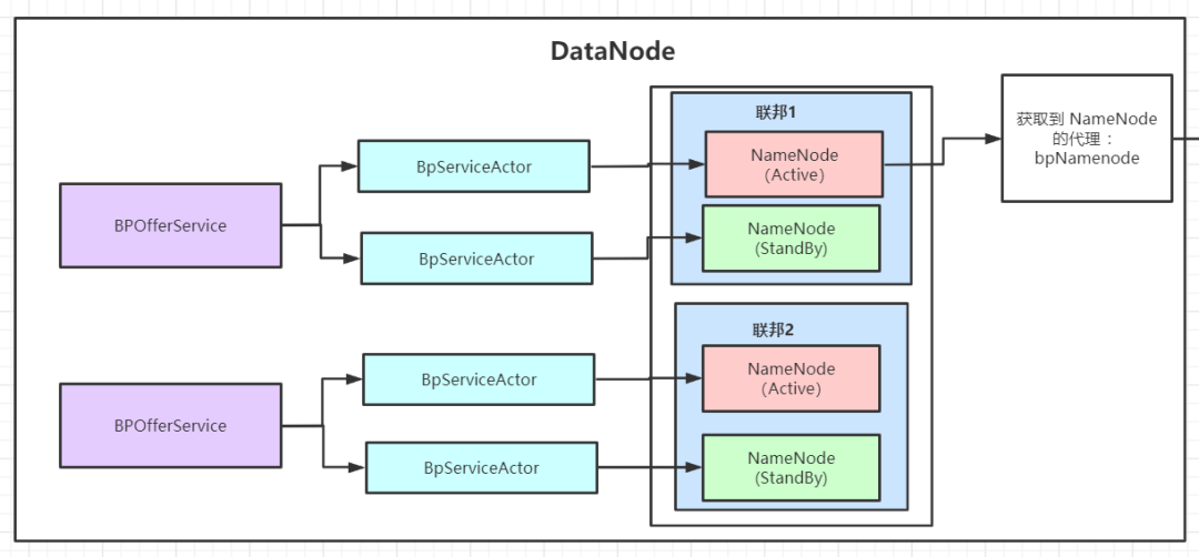 每个 BPOfferService 里面有两个 BpServiceActor,每个 BpServiceActor 对应一个 NameNode。