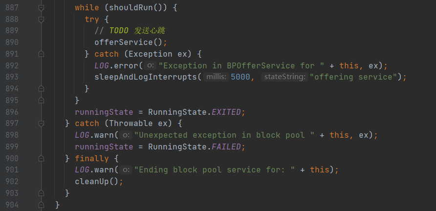 run 方法的上半部分是往 NameNode 注册,下半部分是发送心跳