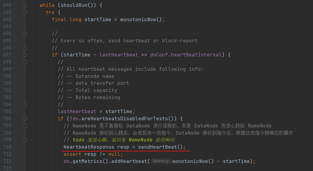 并且更新上一次心跳时间,以便下次判断 DataNode 是否心跳超时。