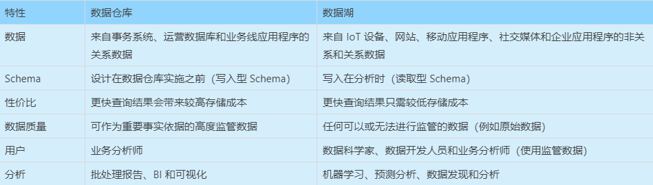 下表展示了数据仓库和数据湖在各个维度上的特性: