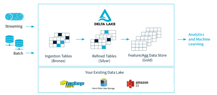 如上图,Delta Lake 是 Spark 计算框架和存储系统之间带有 Schema 信息的存储中间层。