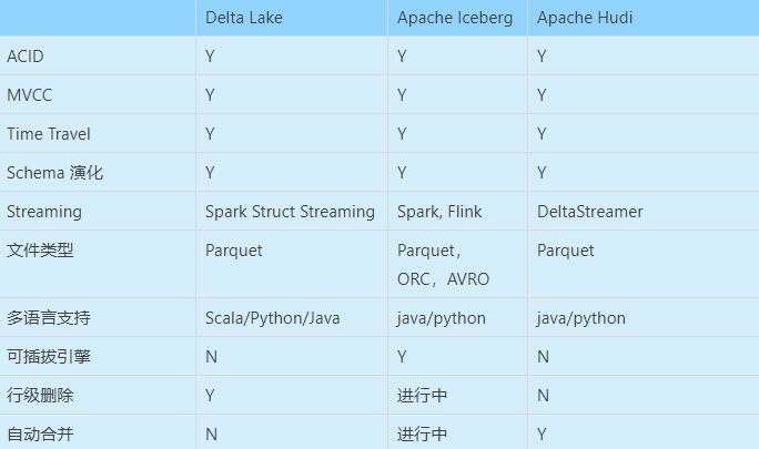 下表从各个维度,总结了三大数据湖框架支持的特性。