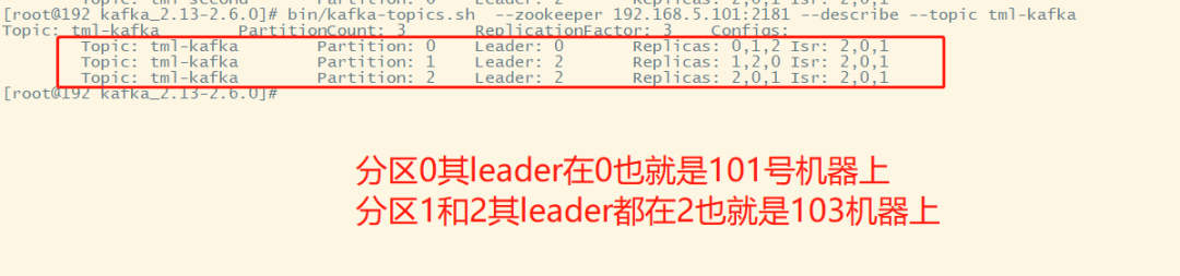 Replicas 显示给定partiton所有副本所存储节点的节点列表,不管该节点是否是leader或者是否存活,这里就是我们的三台机器、0、1、2,分别对应101、102、103。