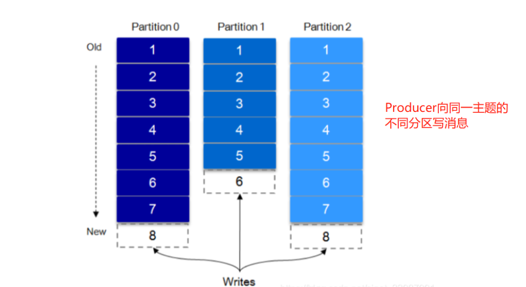 下图为一个消息写入过程,Producer向同一主题的不同分区写消息,也即不停的在各个append log文件后顺序追加消息,每追加一个append log文件偏移量加一,只有单append log文件中有序