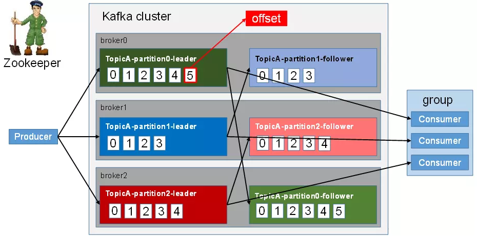 Producer生产者定期向Kafka集群发送消息,在发送消息之前,会对消息进行分类,即Topic, Kafka集群存储该Topic配置的分区中的所有消息。它确保消息在分区之间平等共享。如果生产者发送两个消息并且有两个分区,Kafka将在第一分区中存储一个消息,在第二分区中存储第二消息。 Kafk接收生产者消息并转发给消费者,消费者订阅特定主题,一旦消费者订阅Topic,Kafka将向消费者提供Topic下分区的当前offset,并且还将偏移保存在Zookeeper系统中。消费者通过与kafka集群建立长连接的方式,不断地从集群中拉取消息,然后可以对这些消息进行处理,一旦Kafka收到来自生产者的消息,它将这些消息转发给消费者。 消费者将收到消息进行处理,一旦消息被处理,消费者将向Kafka代理发送确认。消费者需要实时的记录自己消费到了哪个offset,便于后续发生故障恢复后继续消费。Kafka 0.9版本之前,consumer默认将offset保存在Zookeeper中,从0.9版本开始,consumer默认将offset保存在Kafka一个内置的topic中 一旦Kafka收到确认,它将offset更改为新值,并在Zookeeper中更新它。