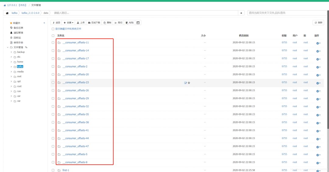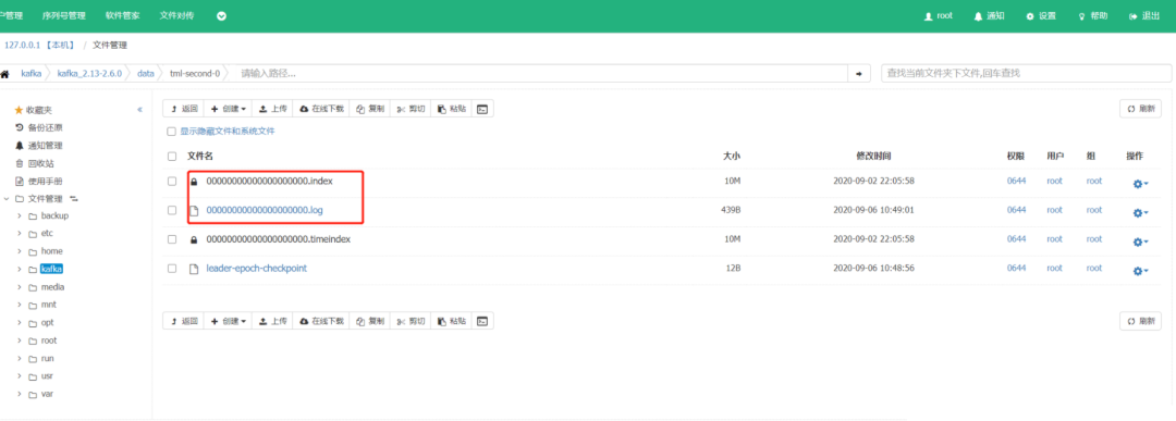 接下来我们发送一条消息,看看在物理存储上是什么样的,在机器上我们可以看到,一组index和log,这就是一个segment的内容: