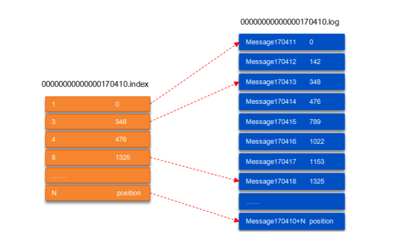 如上图,“.index” 索引文件存储大量的元数据,“.log” 数据文件存储大量的消息,索引文件中的元数据指向对应数据文件中 message 的物理偏移地址。其中以 “.index” 索引文件中的元数据 [3, 348] 为例,在 “.log” 数据文件表示第 3 个消息,即在全局 partition 中表示 170410+3=170413 个消息,该消息的segementoffset为3,全局offset为170413,物理偏移地址为 348(注意此物理偏移地址不是消息数量的offset,而是消息的内存存储偏移量 )