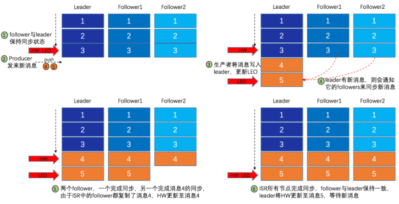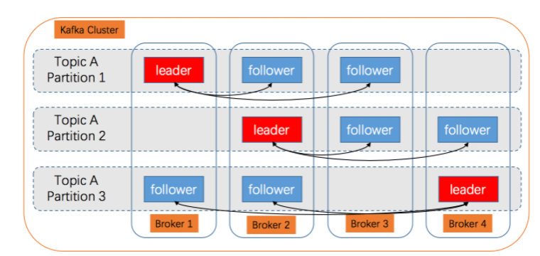 leader 和follwer都是针对某个分区的概念,例如对于分区0,其leader在0也就是broker为101的机器,而对于分区1和分区2其leader在2也就是broker为103的机器上