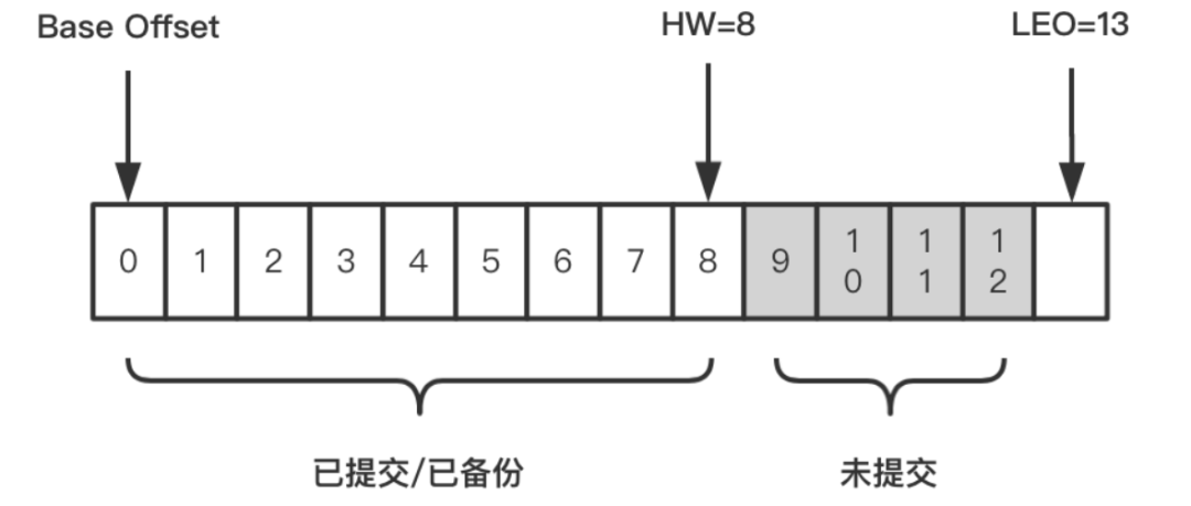 整体消息的生产传递和消费的的流程如下图所示,注意这里偏移量数字从consumer消费的视角来看,无论是生产者还是消费者对消息的处理都是偏移量从小到大的: