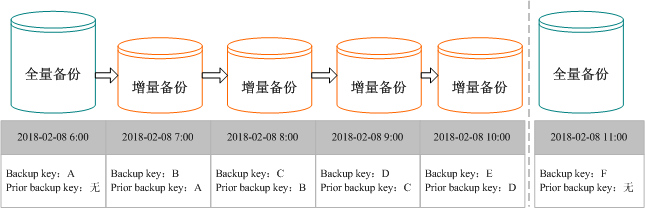 - 2018年2月8日9:00执行了增量备份,--prior-backup-key参数为8:00执行的增量备份的backup key,本次增量备份将自8:00增量备份之后所做的更改进行备份。