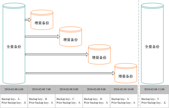 - 增量备份和全量备份的差异点在于,执行增量备份命令时需要提供--prior-backup-key参数,该参数为上次备份的backup key。通过该参数,系统可以获取到上次备份信息,以判断继上次备份之后所更改的数据,用于执行本次的增量备份。详情请参阅“备份命令”章节。