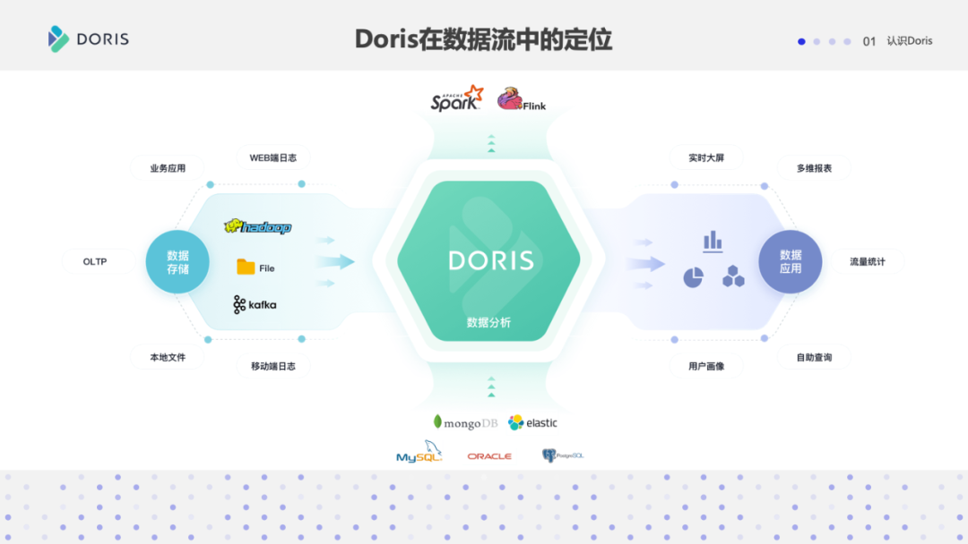 从上面这张图我们可以大致了解 Doris 在整个大数据处理流程中的位置。上游的各类数据如事务数据库中的数据、埋点数据、日志等,通过一些离线系统、消息系统或流处理系统处理后,再导入到 Doris 中进行存储,而 Doris 可以直接对外提供在线报表、多维分析、大屏等数据查询和展示服务。同时,Doris 也可以作为数据源,被 Spark、Flink 等系统访问进行联邦查询或多源数据处理。而 Doris 本身的分布式查询框架,也可以为一些外部数据源如 MySQL、ElasticSearch等系统提供SQL查询能力。