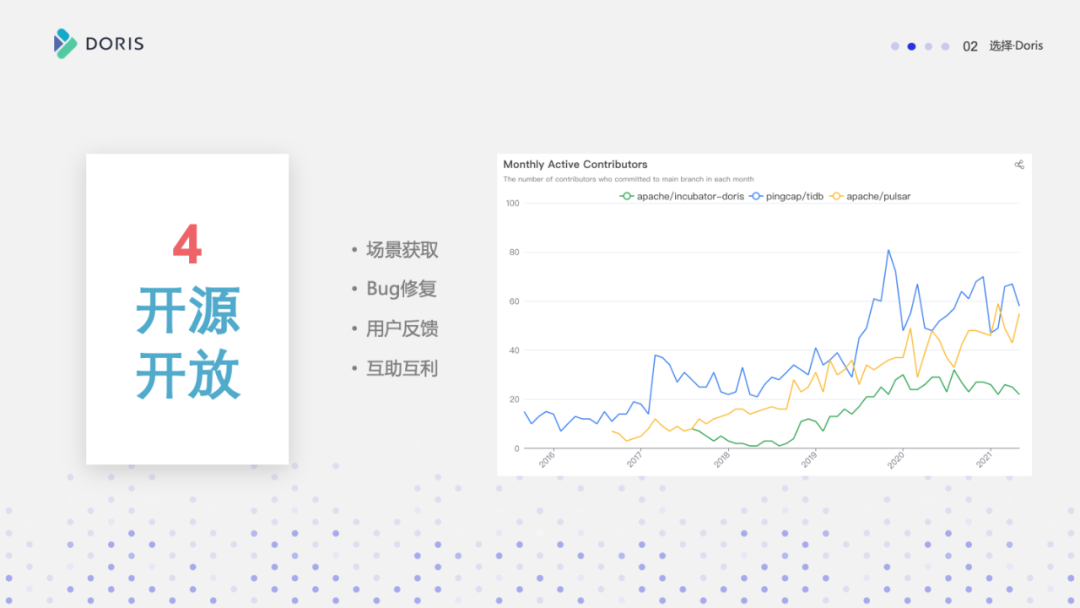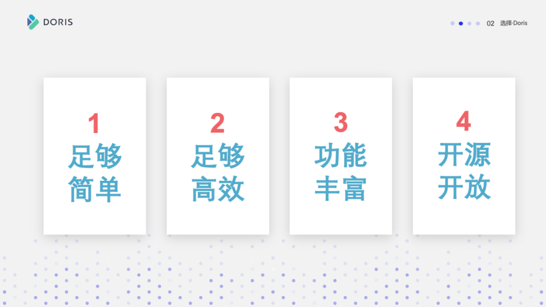 Doris 是什么,发展历程是什么。 为什么要选择 Doris,Doris 提供了哪些功能。 Doris 社区目前正在开展的工作,以及后续的一些发展规划。